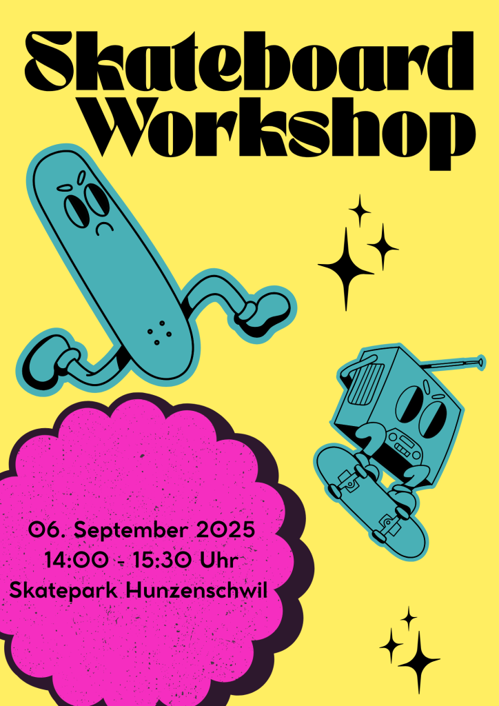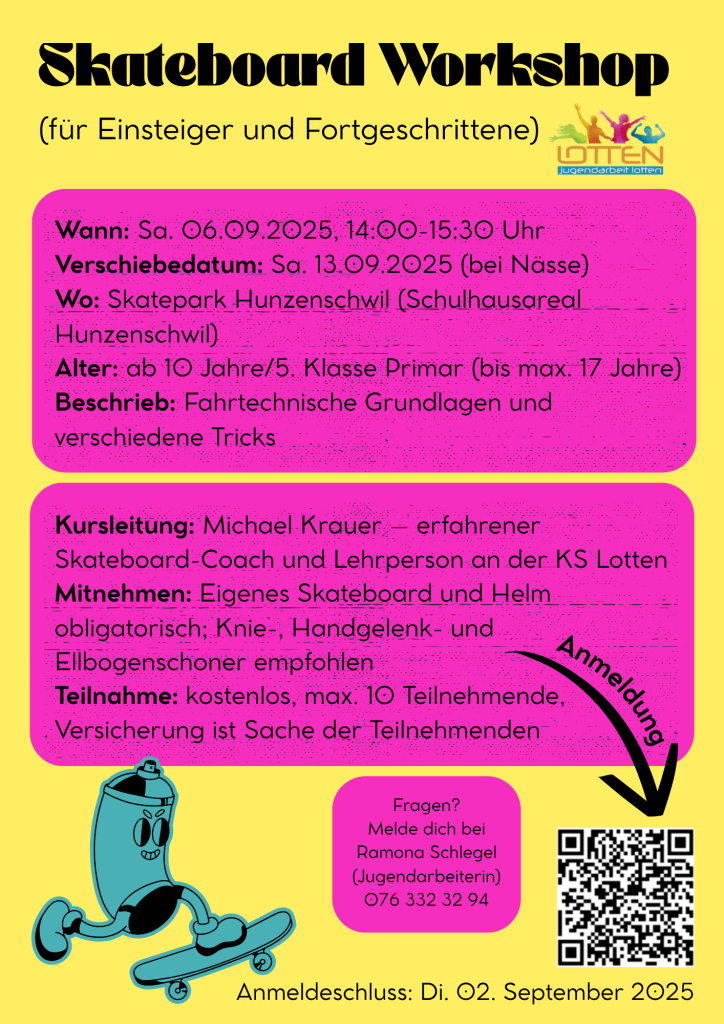 Bock auf Skaten? Dann komm vorbei! Melde dich über den Link an und roll mit uns am Samstag, 6. September im Skatepark auf dem Schulhausareal Hunzenschwil. Let`s go!