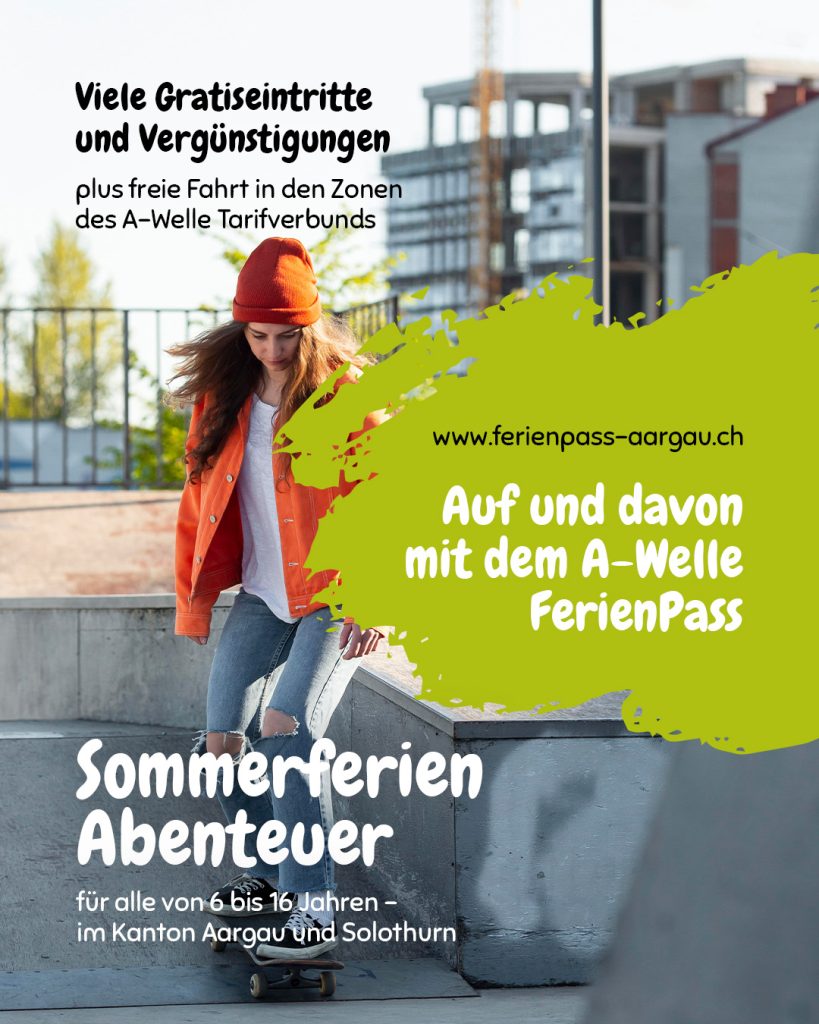 In Zusammenarbeit mit dem Tarifverbund A-Welle erhalten wieder alle Kinder und Jugendliche von 6 bis 16 Jahren die Möglichkeit, während den Sommerferien mit den öffentlichen Verkehrsmitteln im A-Welle Tarifverbund unterwegs zu sein und diverse Attraktionen zu besuchen. Der FerienPass kann ab dem 4. Mai online oder an diversen ÖV-Verkaufsstellen im Kanton Aargau und Solothurn gekauft werden.